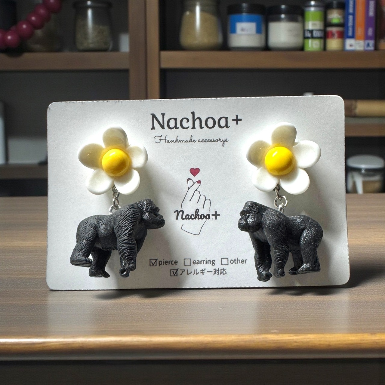 直径約2センチの可愛いお花の下で愛しのゴリラがゆらゆら♡ あなたの耳元を華やかに そして個性的に彩ります♪