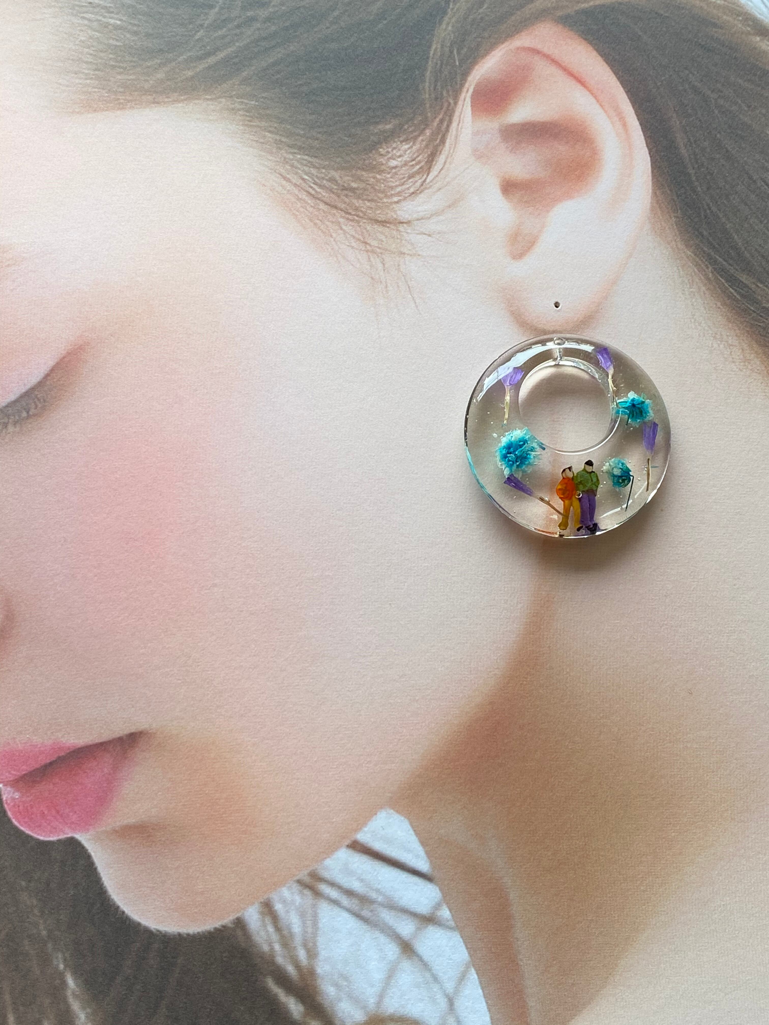 ブルー系のフラワーの中の2人が幸せそうなイヤリングorピアスです❤︎