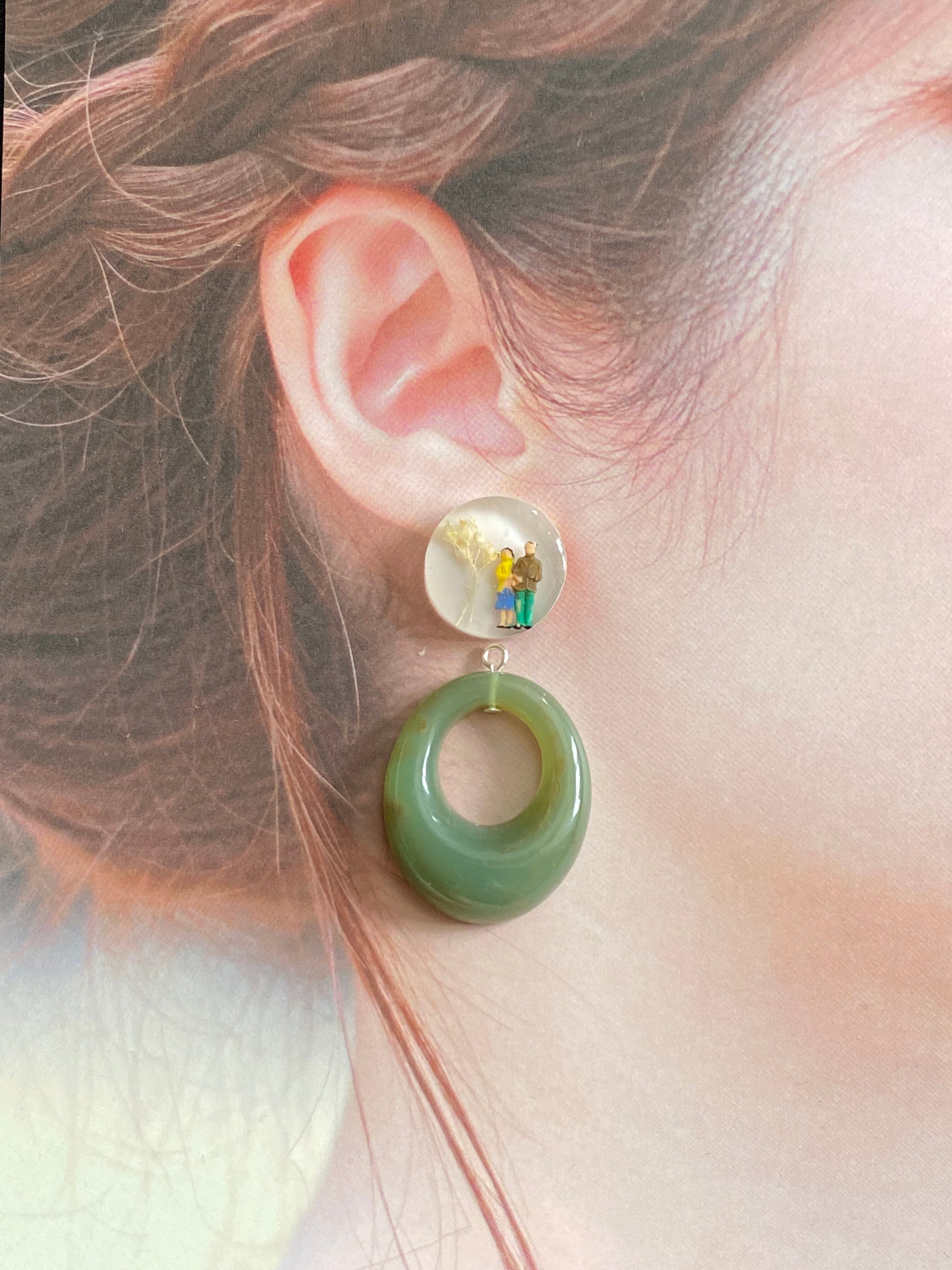 寄り添うカップルをレジンで閉じ込め、大人可愛いグリーンのチャームを付けました(^-^)