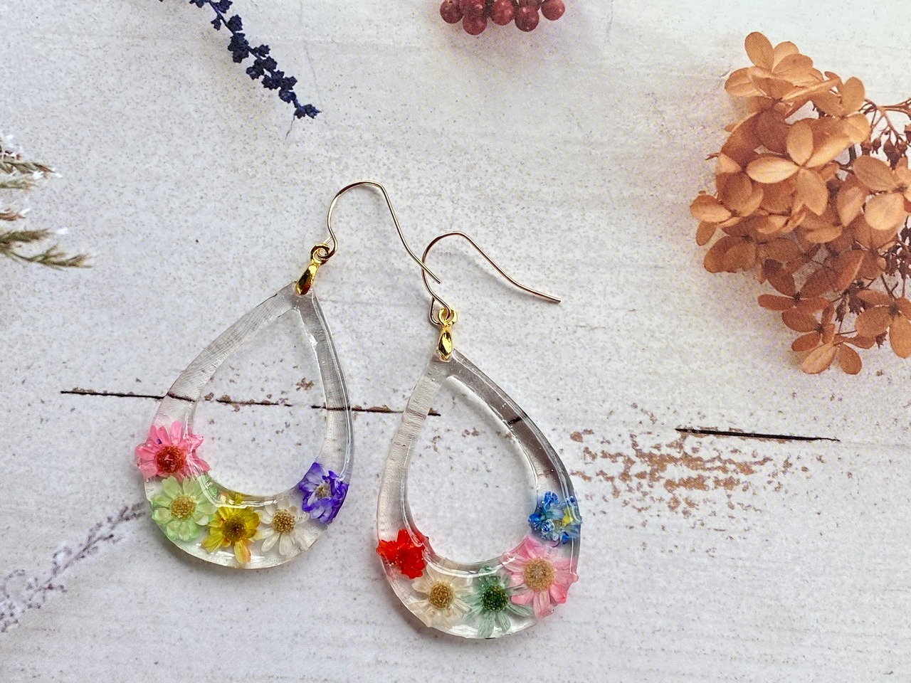 クリアレジンにドライフラワーを並べてみました(^-^) 春夏にぴったりの爽やかで可愛いピアスorイヤリングです(*´꒳`*)