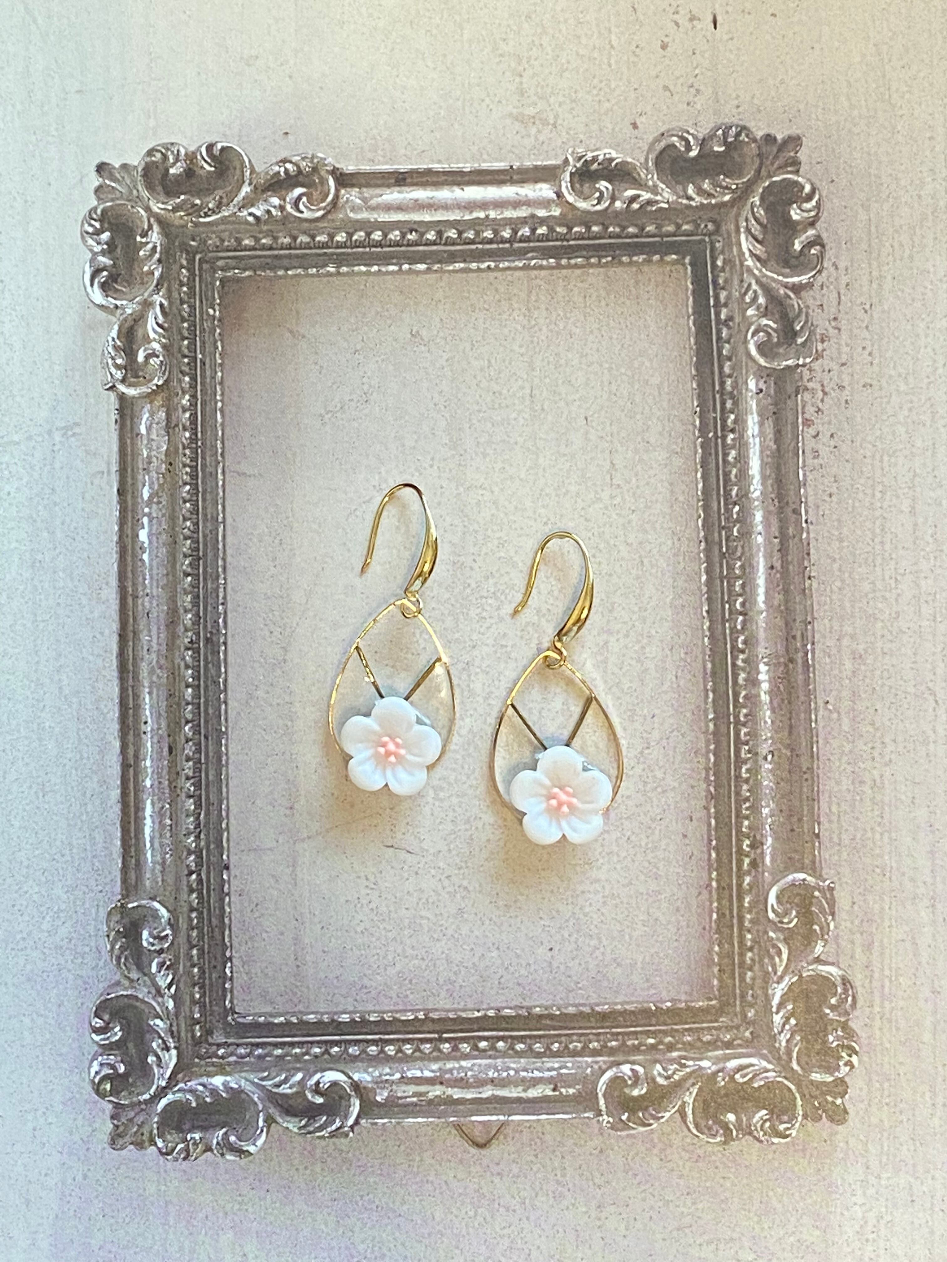 しずく 雫 フレーム レジン 白 花 ホワイト フラワー アンティーク ピアス イヤリング