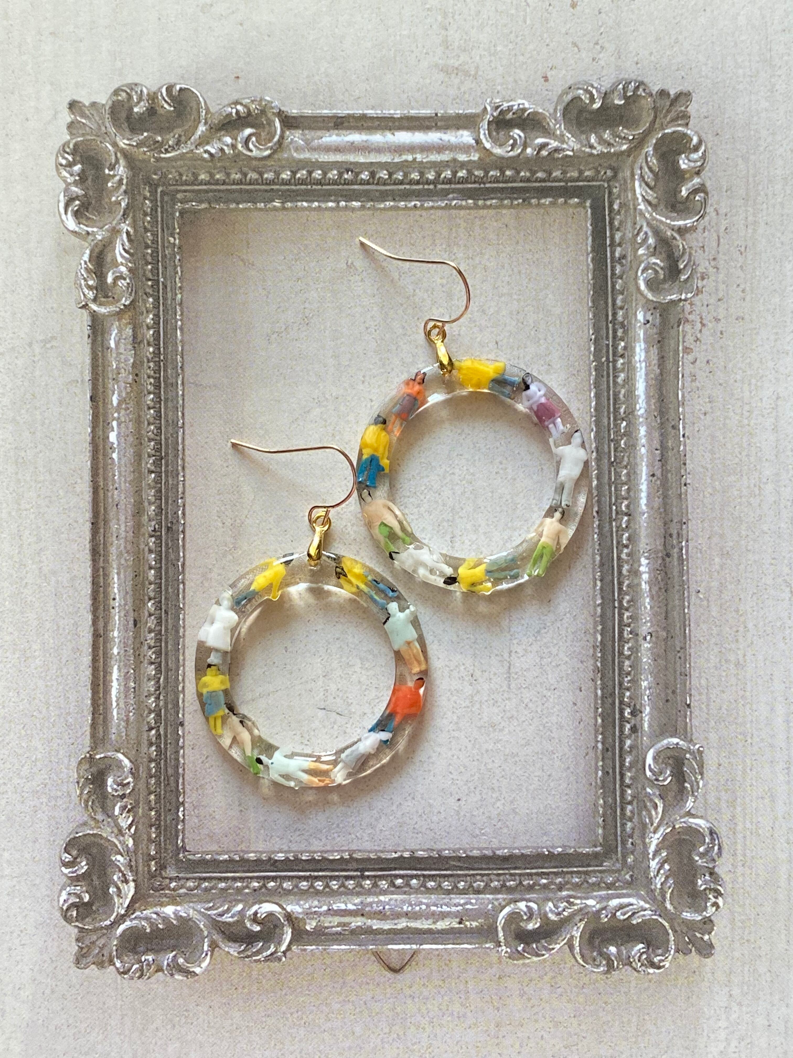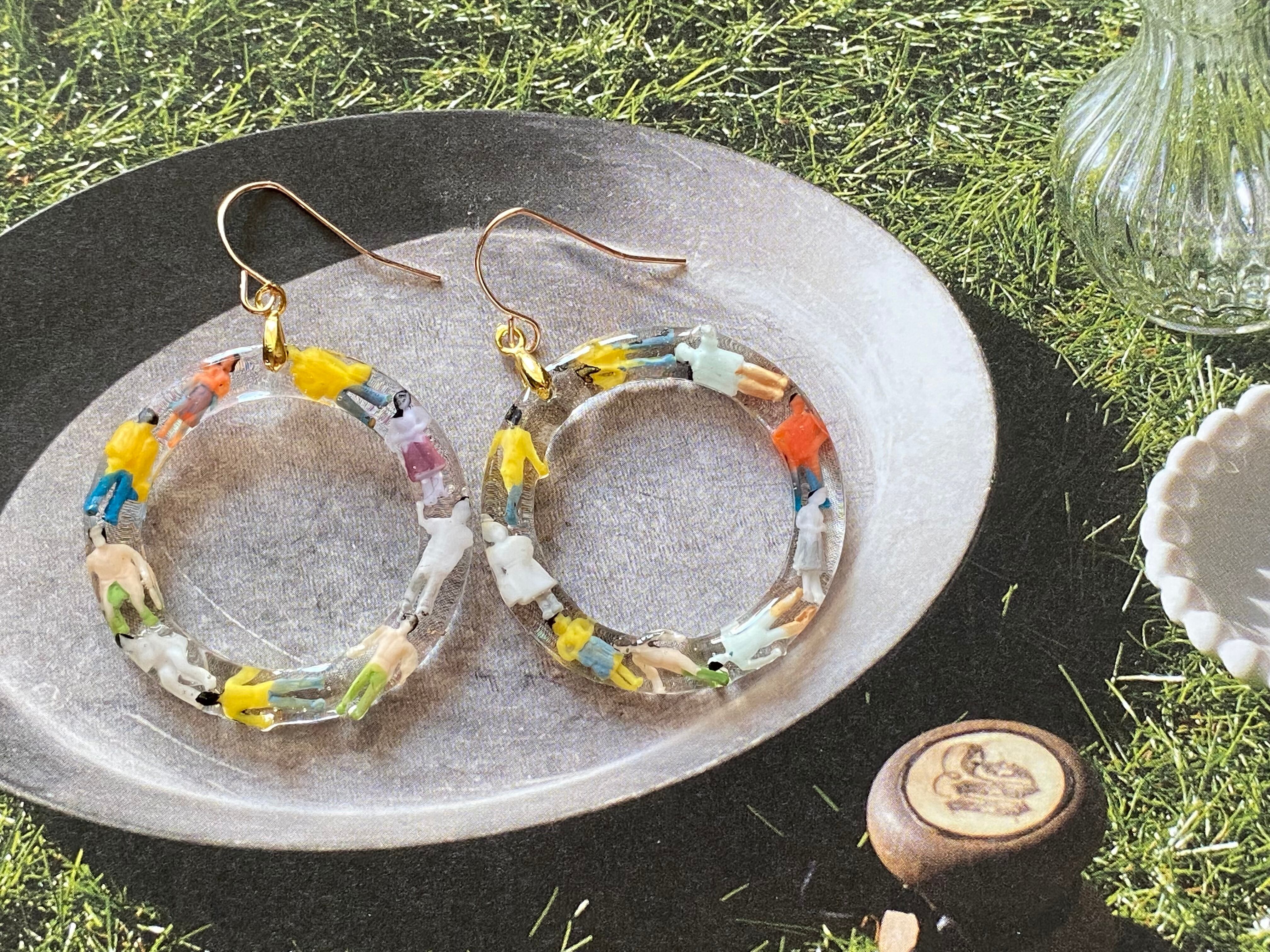 人間 ジオラマ ミニチュア シュール おもしろ インスタ映え 映え レジン いっばい びっちり マーブル カラフル レインボー 個性的 サークル リング 丸 クリア ピアス イヤリング アレルギー対応 大ぶり