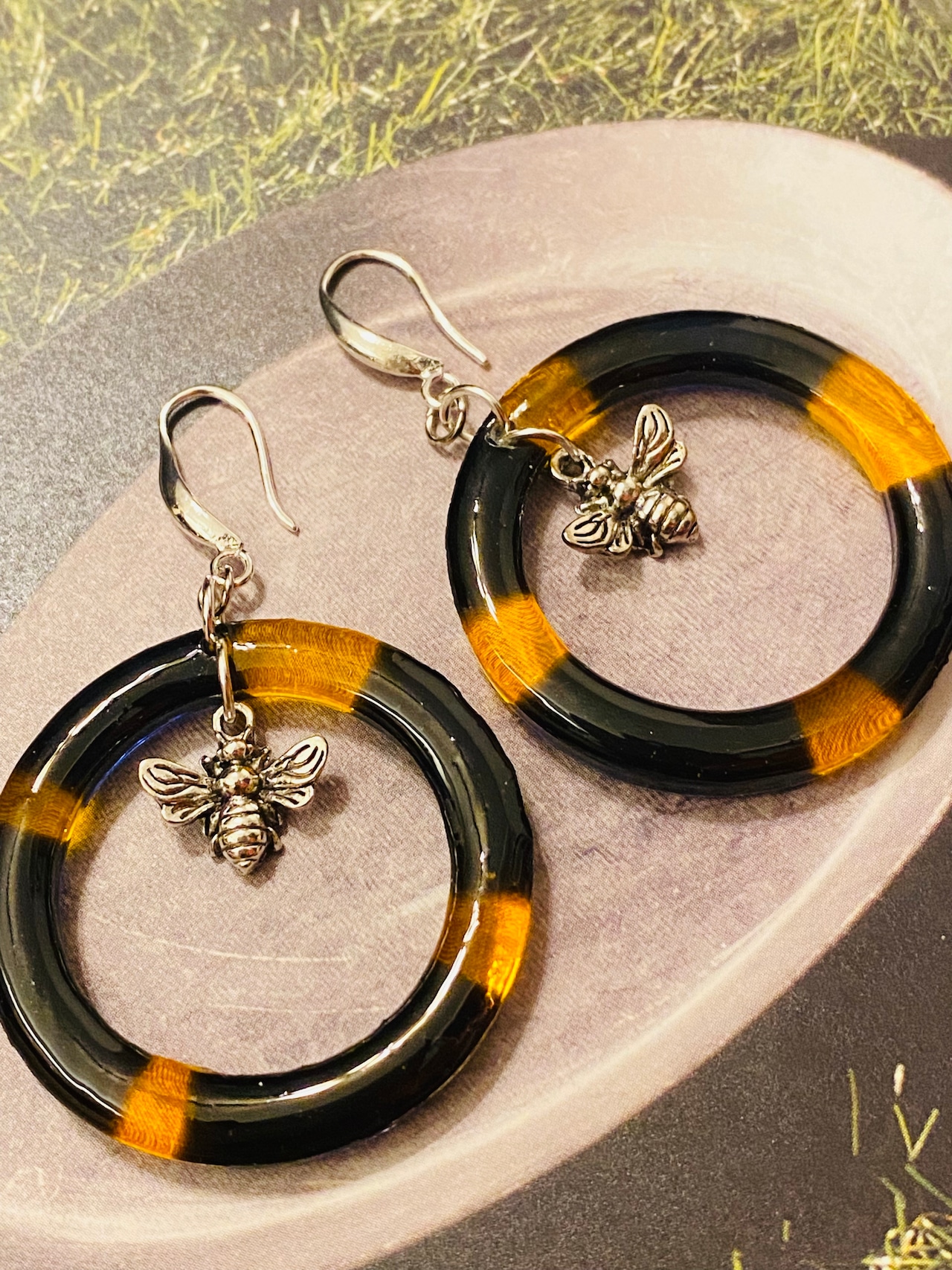 ハチをイメージした黄色と黒のリングの中に、ハチのチャームがゆらゆらと可愛いピアス イヤリングです(^-^)