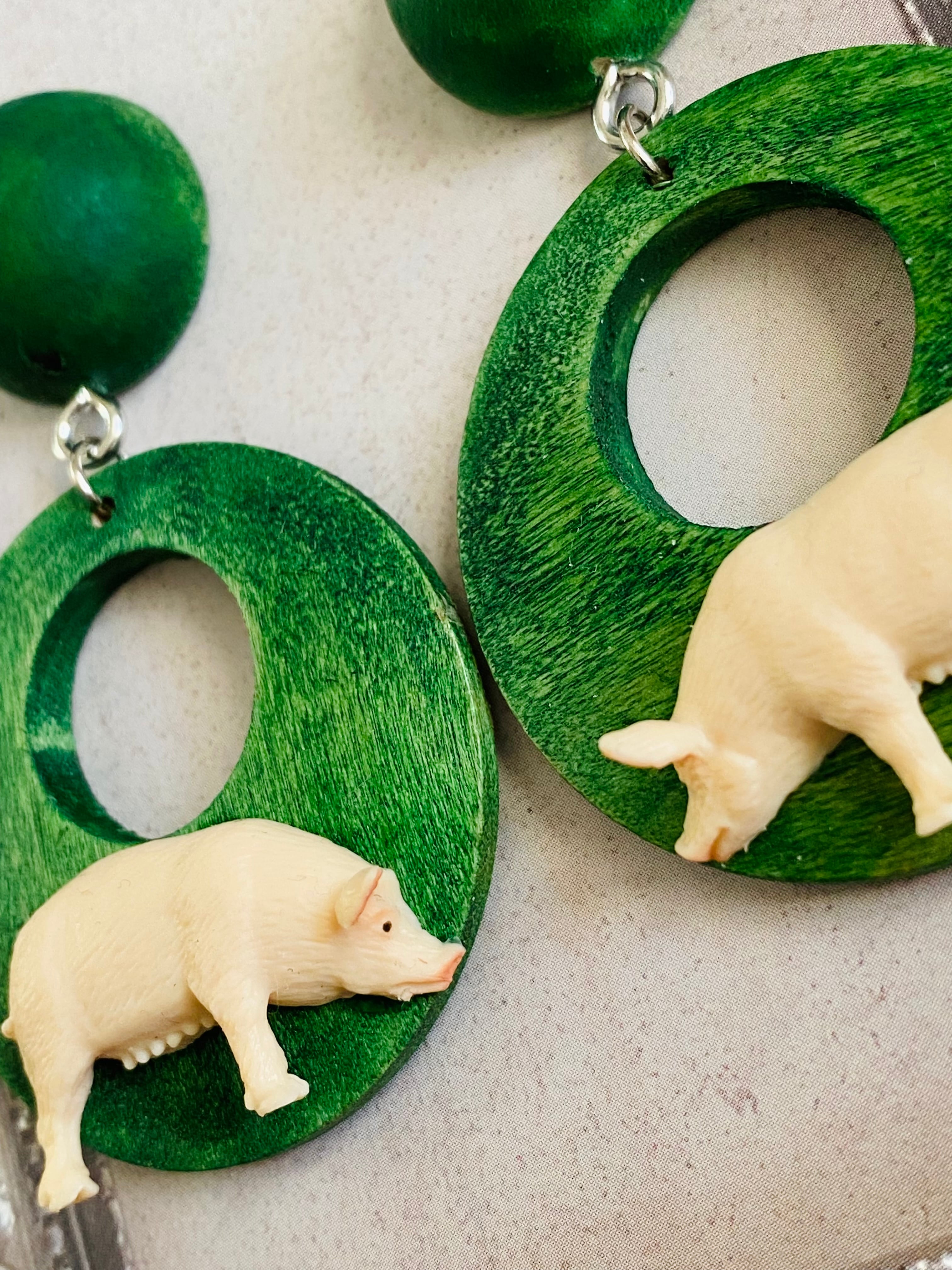 豚 ぶた ブタ 牧場 シュール 自然 ウッド ウッドピアス ウッドイヤリング 木 木製 緑 グリーン 大ぶり 大振り 変なピアス 変なイヤリング 個性的 超個性的 ミニチュア ジオラマ 面白い おもしろ 動物 動物園 プレゼント ピアス イヤリング パーツ変更 アレルギー対応 フィギュア 裏原 裏原宿 奇抜 ギフト プレゼント ラッピング
